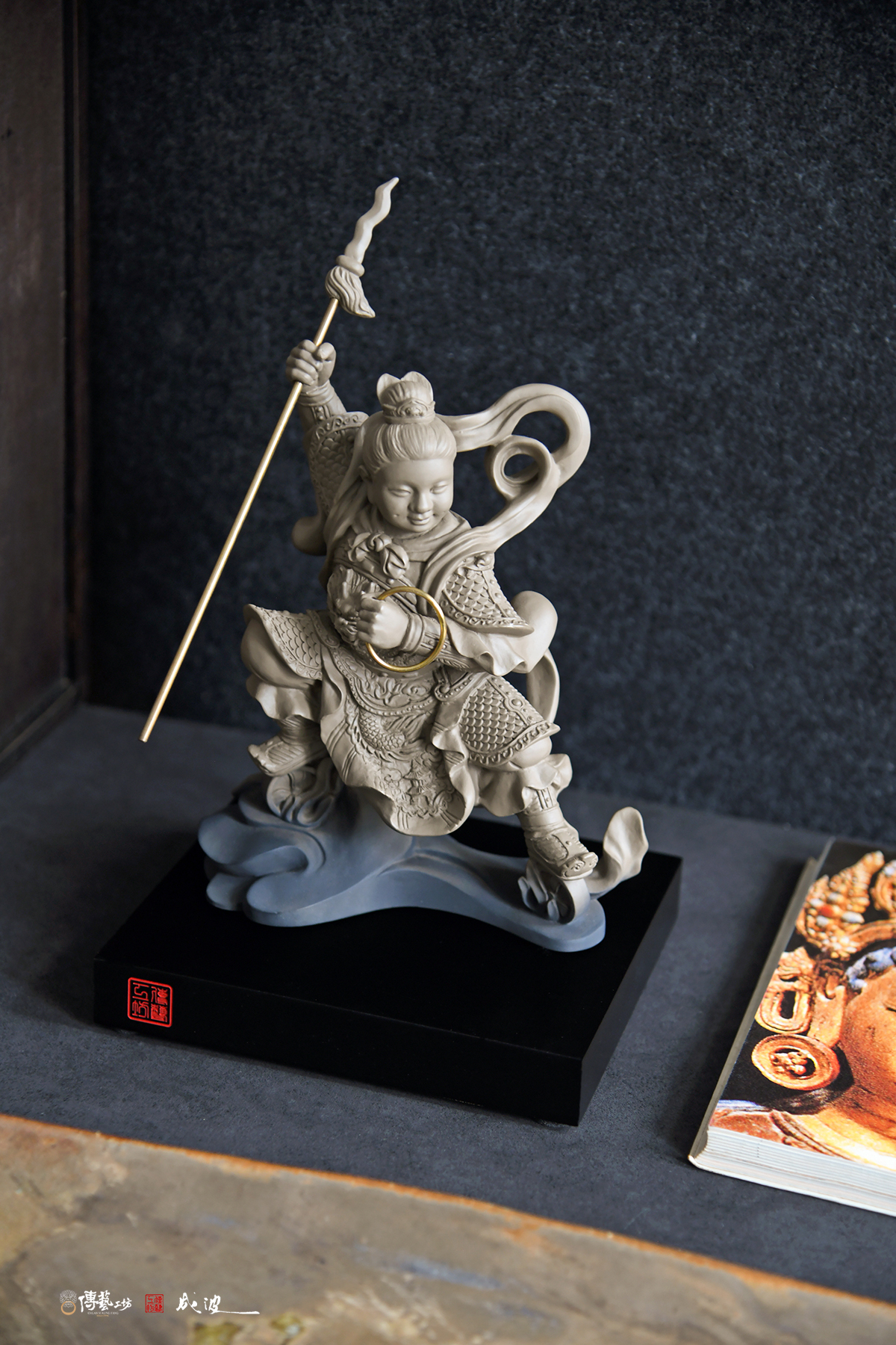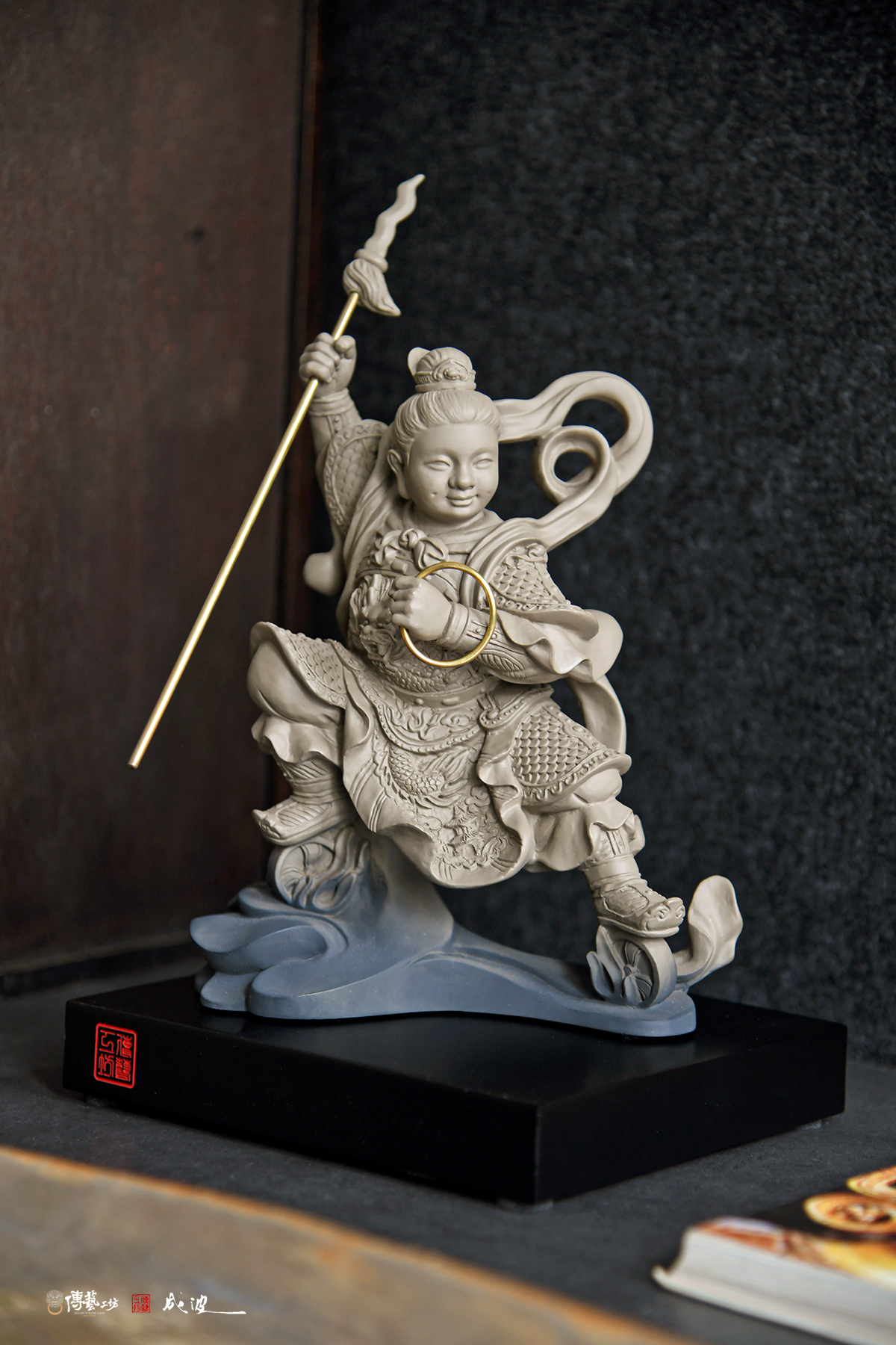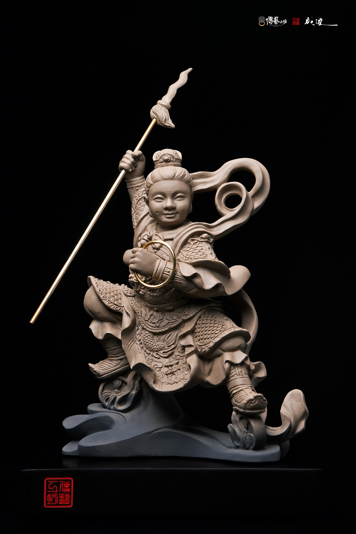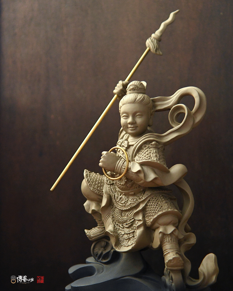 這次雕塑的作品,老師利用精緻的雕塑手法,創作出兒時記憶中的那尊三太子:作品的神情神韻,充滿了童趣與稚氣,太子的面目豐圓,但仍顯得威嚴生動。